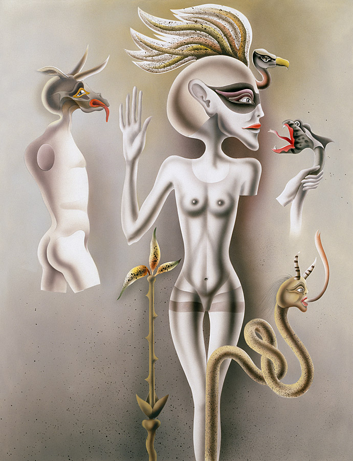 7 Xiaolong, Hundelady aus Peking, Federzeichnung, Kalligraphie 8 La Fleur du Mal, Mischtechnik auf Papier 9 Skurrilitäten, Federzeichnung laviert 10 Berenike in Vorahnung ihres Todes, Airbrush 11 In Memoriam. Hommage an Christian Wagner, Kunstblatt zum 100. Todestag am 15. Februar 2018, 8-farbiger Fine-Art-Pigmentabzug, limitierte Auflage, 100 Exemplare, original handsigniert, Format 58 x 34